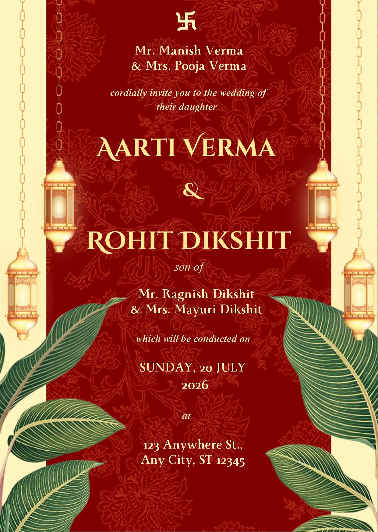 A royal-themed wedding invitation designed with a traditional Indian aesthetic. The design blends deep maroon and gold tones with elegant motifs such as Lord Ganesha, lanterns and tropical leaves to create a luxurious and auspicious feel. The invitation is suitable for both digital sharing (WhatsApp / website) and high-quality print use.